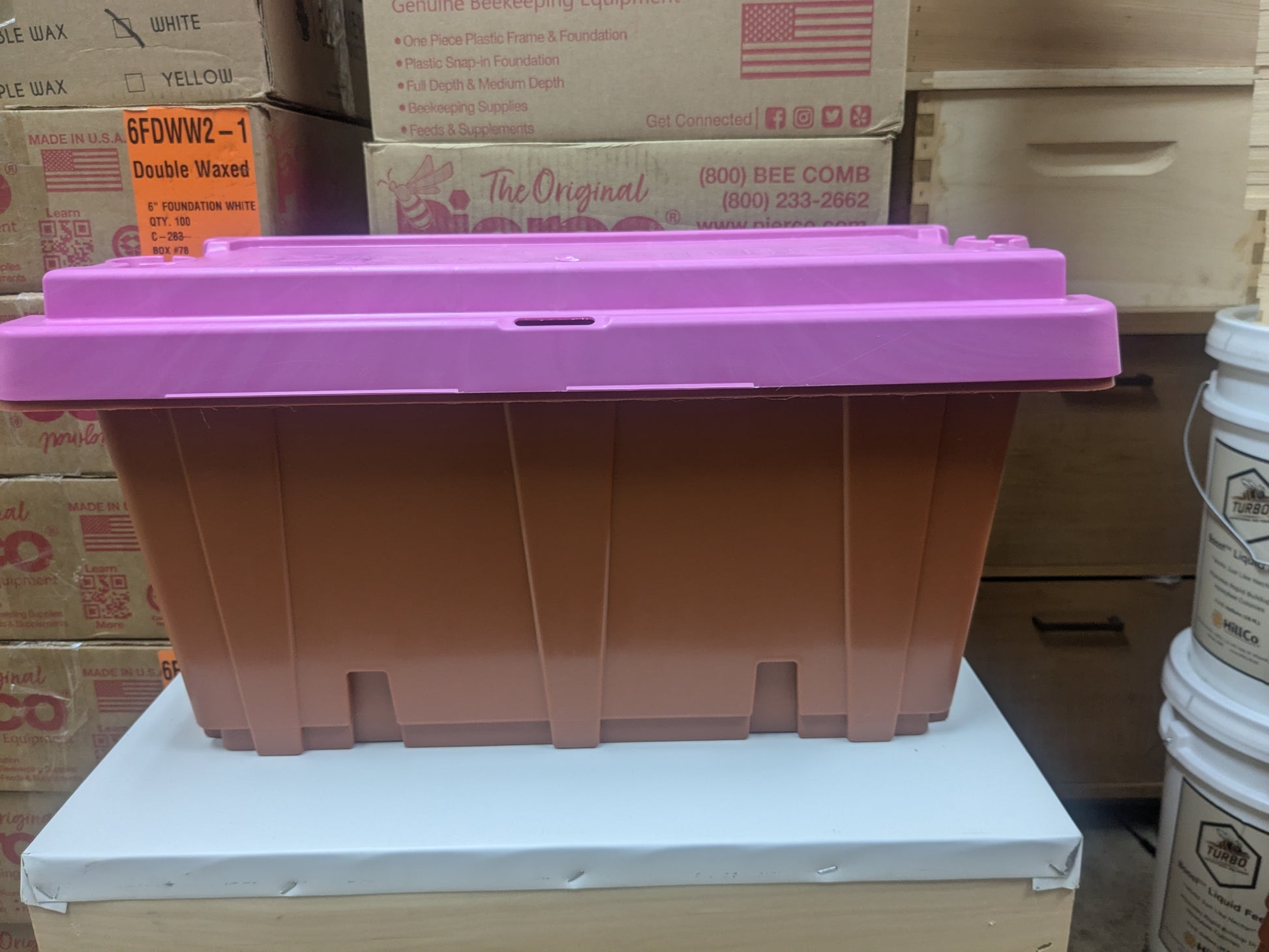 The 5 frame ProNuc is one of the best inventions in modern beekeeping. It's a recyclable plastic tote designed to replace flimsy cardboard nucs for transporting bees safely and securely, and looks good doing it!